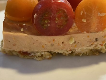 今日は娘とトマトチーズケーキをつくりました。氷川きよしがテレビで紹介していたものです。ドライトマトをベースのクラッカーに混ぜて、クリームチーズにはミニトマトをミキサーにかけたものを混ぜ固まったら最後にミニトマトを飾りゼラチンで固めるというもの。紙の型を使ったので、半分以上ゼラチンが流れ出てしまって、ミニトマトが露出してしまいました。クラッカーを叩いて砕いたり、トマトをつぶしたり、クリームチーズを練って柔らかくしたりは面白かったのですが、味はもう少し甘いイチゴとかブルーベリーの方がよかったかな。20. 06/12