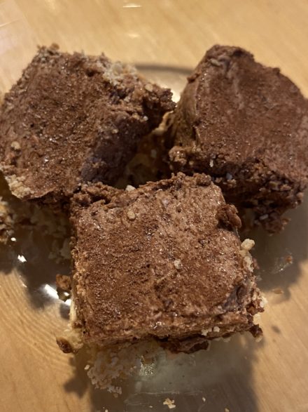 チョコレートアイスケーキです。生クリームと板チョコを混ぜてムース状にしてクッキーを砕いて敷いたものに乗せて固める→昨日よりさらに簡単デザートです。20. 06/13
